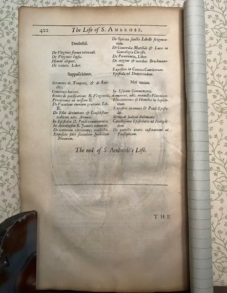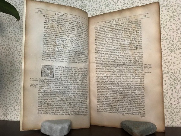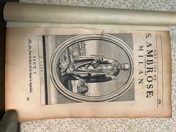 Volume in folio, falsa brossura con al piatto riprodotto il frontespizio dell'opera, dalla pagina 359 alla 422, incisione in rame con S. Ambrogio in primo piano e sullo sfondo la citt di Milano, a piena pagina. Incisiva agiografia del gran Vescovo di Milano, pilastro della Chiesa, sue gesta e suoi scritti, il tutto presentato in modo chiaro ed estremamente raffinato. In bello stato, da sottolineare la bellezza dell'incisione e la rara reperibilit. Notevole