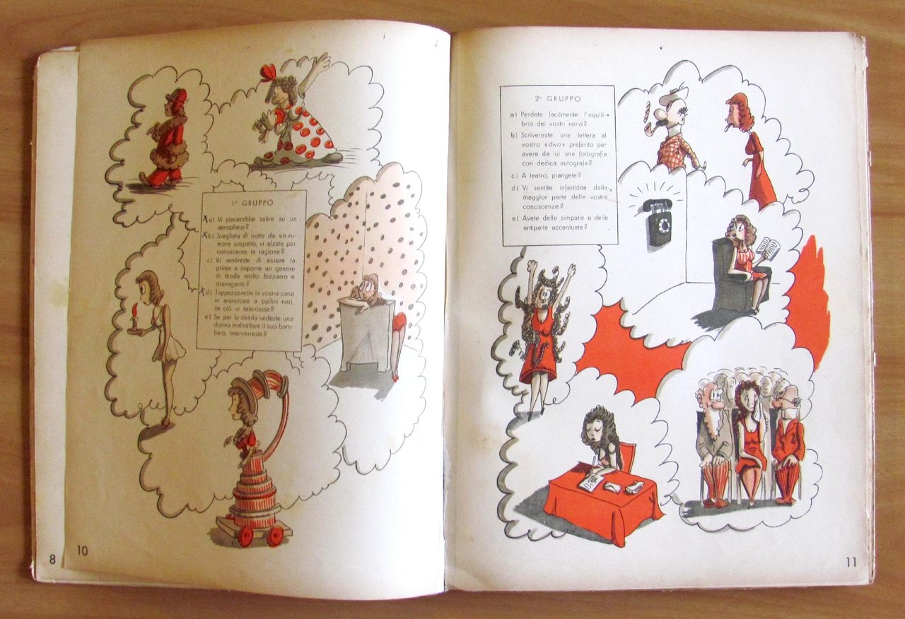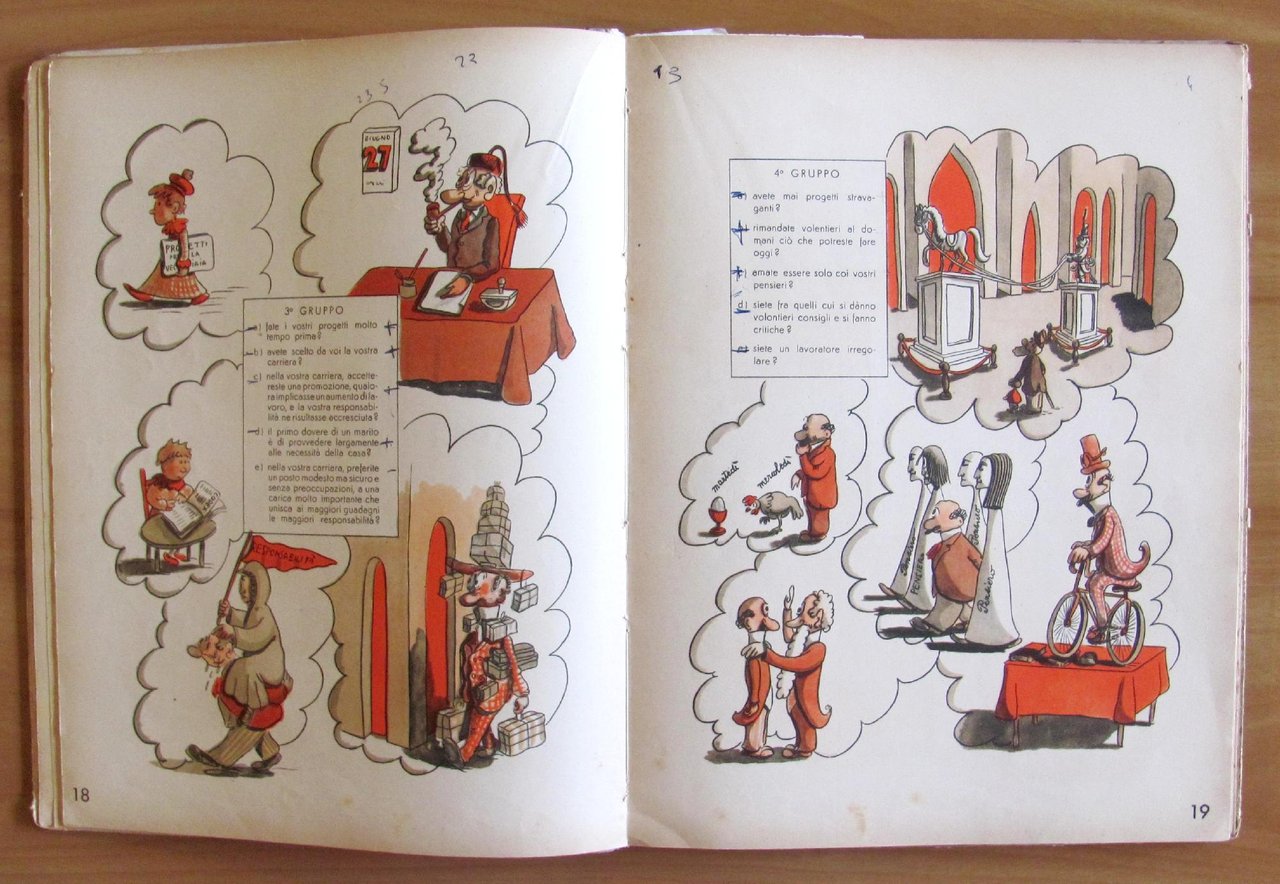 98 simpatiche illustrazioni e tavole a colori di Mosca. Editrice Giochi - Milano, 1945. Cartonato editoriale con dorso rinforzato e lievi tracce d'uso alle copertine. Piccole spunte a penna alle due pagine di domande. 23,5x31; pp.153. Libro tipo gioco con domande per gli Uomini e per le Donne