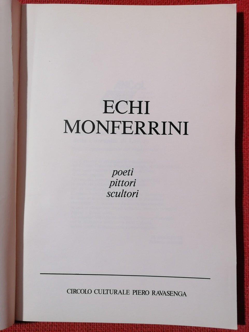 ECHI MONFERRINI. Poeti, pittori, scultori Circolo culturale Piero Ravasenga Edizione in 2000 esemplari del 1988, raro Condizioni accettabili: unico segno evidente l'appunto a pennarello in copertina (vedi foto)