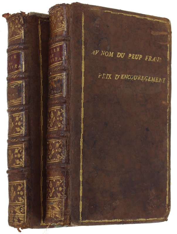 (Codice LF/1898) Deux volumes in 12°, VIII-397[3]+XII-420 pp. Reliures basane époque, plats encadrés, avec inscriptions dorés "Au Nom du Peup Fran Prix d'Encouregement" et "Accordé par l'Admr Genl l'Annee X". Gardes marbrées, tranches rouges, signets soie. En-tete, lettrines. Ex.libris à la plume et au titre (1er volume seul), coiffes un peu frottés. ~~~ SPEDIZIONE IN ITALIA SEMPRE TRACCIATA