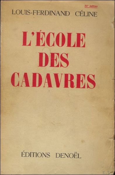 original broche illustre de l'editeur, 305 pages+14pp. 4 photo's, . Edition de l'annee de l'originale, fausse mention de 36eme edition. ******* L'ECOLE DES CADAVRES n'st pas dirigee contre personnes. Elle attaque une politique. Afin de couper court a tout polemique particuliere, l'ateur et l'editeur de ce livre ont resolu, daccord, de supprimer les pages 17 et 18, 121 et 122, 301 et 302 de cette edition et de toutes celles qui suivront ******