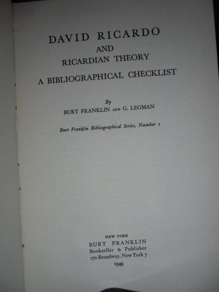 (Economia) DAVID RICARDO and Ricardian Theory a Bibliographical Checklist By Burt Franklin and G. Legman. New York, Burt Franklin, 1949. In-8° tela verde con titolo in oro sul dorso. 88 pp. Come nuovo. Neg. mob. bianco.