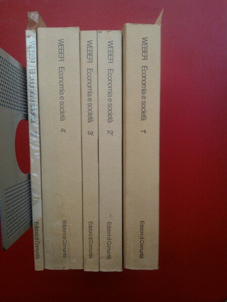 Edizioni di Comunità 1981- 86, II- III ed., Classici della sociologia, 5 volumi in brossura, vol. I Teoria delle categorie sociologiche, pp. 321 (III ed. 1986), vol. 2° Economia e tipi di comunità, pp. 331( II ed. 1981), vol. 3° Sociologia del diritto, pp. 211 (II ed. 1981), vol. 4°Sociologia politica, pp. 573 (II ed., 1981), vol. 5° I fondamenti razionali e sociologici della musica pp.87 (II ed. 1981). introd. di Pietro Rossi, trad. di Tullio Bagiotti, Franco Casabianca, Pietro Rossi,Giorgio Giordano, Pietro Chiodi, su ed. critica del 1956 di J. Winckelmann. I 5 volumi sono in condizioni molto buone.
