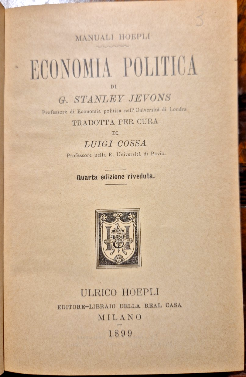 Economia politica di Stanley Jevons 1899 hoepli manuale libro Luigi Cossa traduz