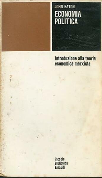 Nuova ed. riveduta. 317 p. ; 18 x 10 cm. Piccola biblioteca Einaudi, 165. Chi si sia accinto allo studio dell’economia marxista conosce le difficoltà dell’impresa: Il capitale non è opera per lettori sprovveduti e richiede l’ausilio di una introduzione a quella teoria e a quella analisi; cosí come è necessario mettere gli elementi essenziali della economia marxista alla portata di chi non abbia la possibilità di approfondire lo studio sui testi classici. A tale doppia esigenza soddisfa questo «manuale», nato dal lavoro di un gruppo di economisti e marxisti inglesi, sotto la direzione di John Eaton. È una esposizione condotta secondo le migliori tradizioni della scienza economica inglese, che ora presentiamo in una nuova edizione riveduta, aggiornata e ampliata: i capitoli sulla crisi economica e la distribuzione del prodotto nazionale tengono conto dei più recenti sviluppi, ed inoltre è stata aggiunta una nuova parte sulla teoria economica keynesiana. Titolo originale dell'opera: «Political Economy. A Marxist Texbook». Traduzione di Claudio Napoleoni. Le parti aggiunte nella nuova edizione sono state tradotte da Francesco Ciafaloni. Brossura editoriale, coperta in cartoncino flessibile plastificato lucido e colorato. Qualche leggero segno del tempo alla coperta, al dorso, al taglio, per il resto libro integro. Codice libreria 6387.