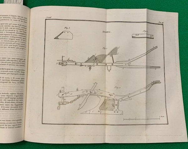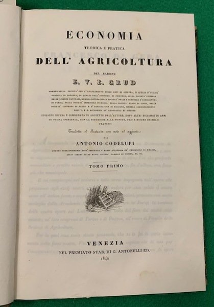 In 4°; tre tomi in un volume: (8), 244 pp. e IV c. di tav. più volte ripiegate, 162 pp. e V-VII c. di tav. più volte ripiegate, (2 b.), 64 pp. Legatura coeva in mezza-tela grigia con titolo, autore e numeri dei volmi impressi in oro al dorso. Piatti foderati con bella carta marmorizzata coeva. Esemplare completo ed in buone-ottime condizioni di conservazione. All'interno in ottime condizioni di conservazione dalla carta pulita e senza le macchioline di foxing spesso presenti. Prima edizione italiana, la primissima uscì in francese nel 1839, di questo celeberrimo manuale di agronomia ed economia agricola, scritta dal Barone Crud Elie Victor Benjamin (1772-1845) che si ispirò per la sua opera alla sua grande tenuta in Romagna di Massa Lombarda e Sant'Agata nella Legazione di Ferrara che fra le produzioni agricole poteva vantare barbabietole, erbe mediche, bestiame, frumento, cereali, legumi, pecore, cavalli e formaggi ecc. Proprio l'ultimo libro di 64 pagine è completamente incentrato sulla descrizione dell'attività della sua tenuta romagnola. Il volume si presenta nella traduzione del noto professore di Agraria all'Università di Perugia, di Bologna e a Jesi, nato a Reggio Emilia e morto a Roma, Antonio Codelupi. Rif. Bibl.: Fumi 3671.