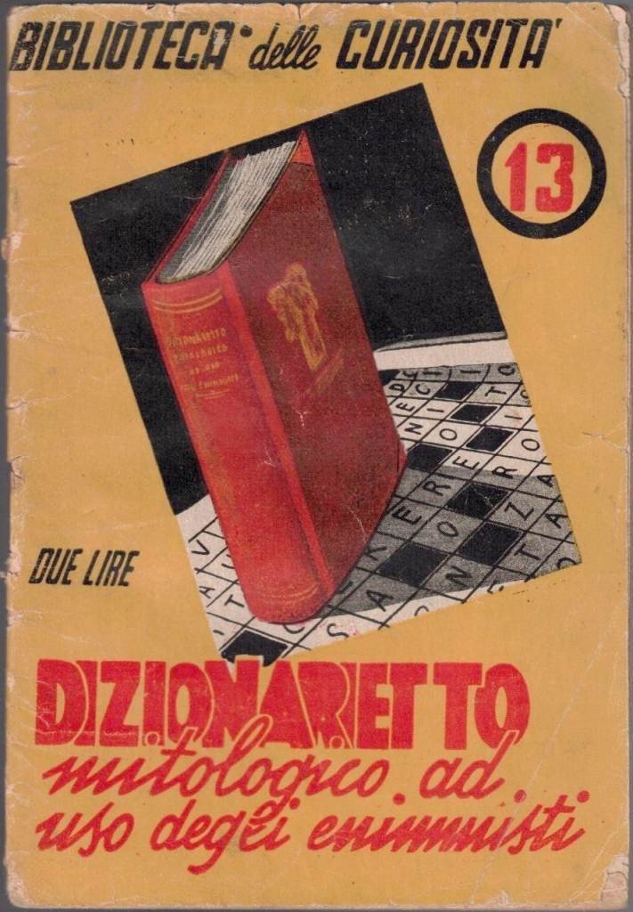 Edipino, Manuale mitologico dell’enigmistica, Editoriale Esperia, Roma s.d. (ma 1943?), pp. 39, cm 16, rilegatura ed. a punto metallico. Collana Biblioteca delle curiosità, vol. 13. Titolo alla prima di copertina: Dizionarietto mitologico ad uso degli enimmisti. Dizionarietto di nomi mitologici ad uso degli enigmisti. Per agevolare la ricerca i vocaboli sono raggruppati secondo il numero di lettere che li compongono e disposti in ciascun gruppo in ordine alfabetico. Tracce d’uso, una annotazione a margine della quarta di copertina, lieve brunitura della carta, ma comunque ancora buona copia. Raro.