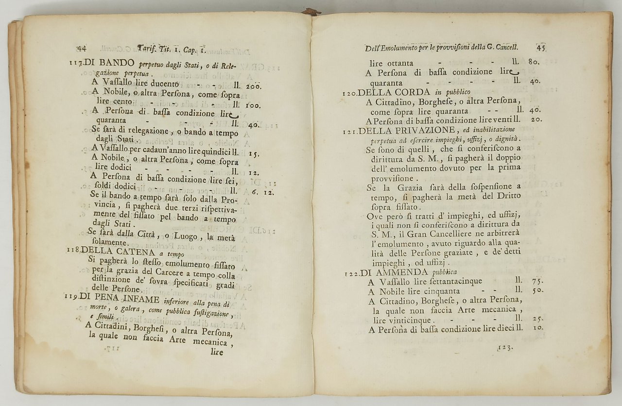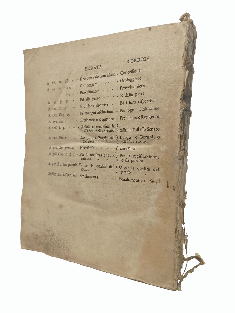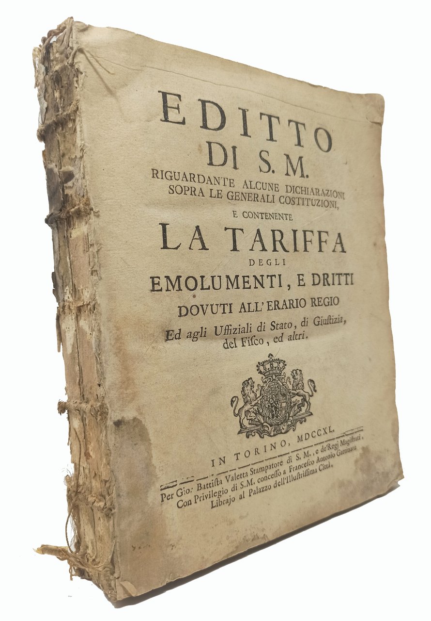 In Torino, MDCCXL [1740]. Lingua del testo: italiano. Dimensioni: 18 x 23 cm circa. Stato di conservazione: Manca totalmente la brossura; un piccolo taglietto, senza mancanza, sul margine verticale del frontespizio; una piccola mancanza sul margine verticale del foglio che contiene le due pagine 3 e 4; ordinarie macchioline e modesti ingiallimenti; margine inferiore del frontespizio un po' 'sporco'; 'orecchiette'; un leggero alone sul margine inferiore di alcuni fogli (presumibilmente causato da una pregressa umidità). Privo di scritte, sottolineature o altri segni nel testo. Interno fersco. Curioso in quanto riporta i diversi emolumenti delle varie figure pubbliche del Regno (del maggiordomo di Sua Maesta, del porta archibuso, del Vicario, dello scultore, del revisore di sentenza, dell'organista, del munizionere, del chirurgo, del barbiere, del conservatore dei Boschi d'Exiles, .), i diritti dovuti nella materia criminale agli Uffiziali di Giustizia, . Molto curiosa anche tutta la parte che riguarda la giustizia del tempo che prevedeva, tra l'altro, carcere, tortura e simili pene. Un puntuale tariffario che prevede atti, figue ecc., ormai in gran parte scomparsi.