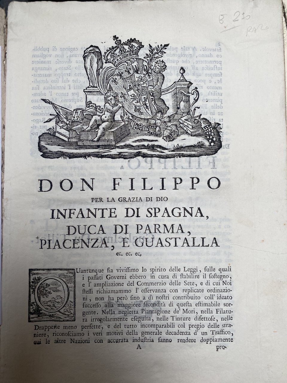 Editto o sia nuovo regolamento ordinato da S.A.R. per il commerzio delle sete nella città e Stato di Parma (Don Filippo per la grazia di Dio infante di Spagna, Duca di Parma, Piacenza e Guastalla)
