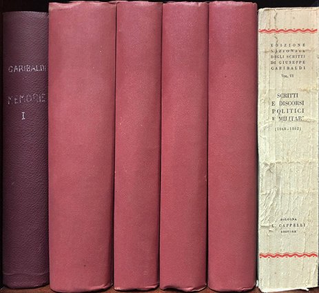 Serie completa: vol I Le memorie di Garibaldi ante 1872, vol II Le memorie in redazione definitva del 1872, Vol III I Mille, Vol IV, V, VI Scritti e discorsi politici e militari. Tutti i volumi con yavole fuori testo