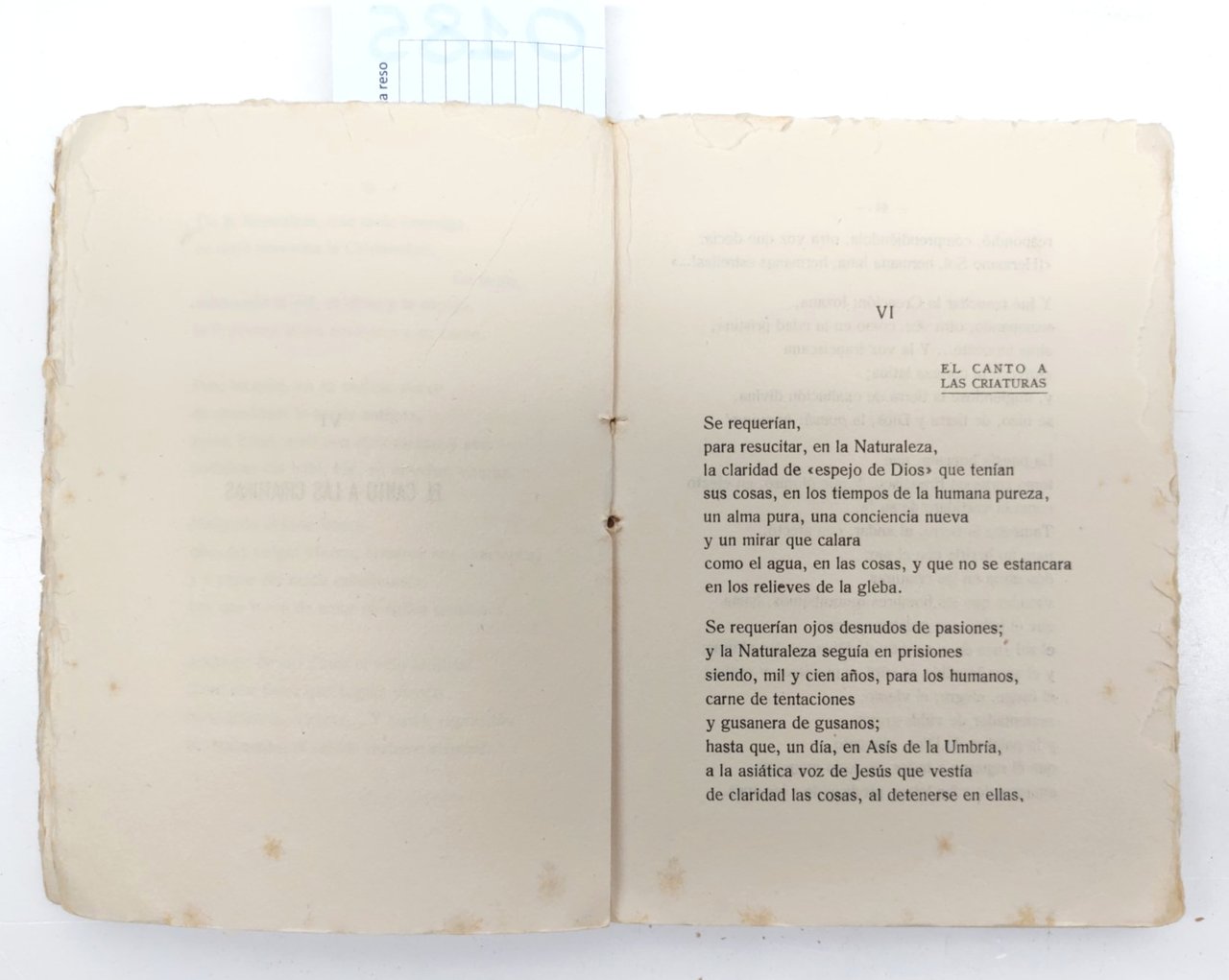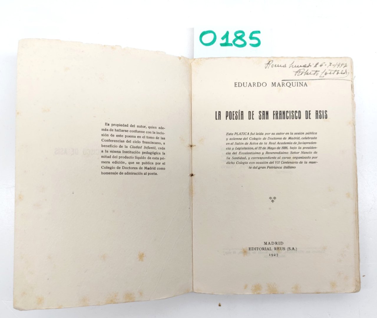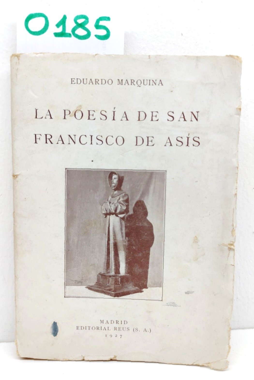 EDUARDO MARQUINA LA POESIA DE SAN FRANCISCO DE ASIS MADRID EDITORIAL REUS (S.A.) 1927 COPERTINA EDITORIALE MORBIDA CON UNA MACCHIA E PICCOLI STRAPPI ALL'UNGHIA, INTERNO IN BUONE CONDIZIONI FRONTESPIZIO CON FIRMA DI POSSESSO FIORITURE DIFFUSE, TAGLI IRREGOLARI, CARTA OVATTATA, UNA MACCHIA ROSSA ALLA QUARTA DI COPERTINA LE ULTIME QUATTRO PAGINE SONO A FOGLI CHIUSI N. PAG. 102 CM. 12,7 X 18.