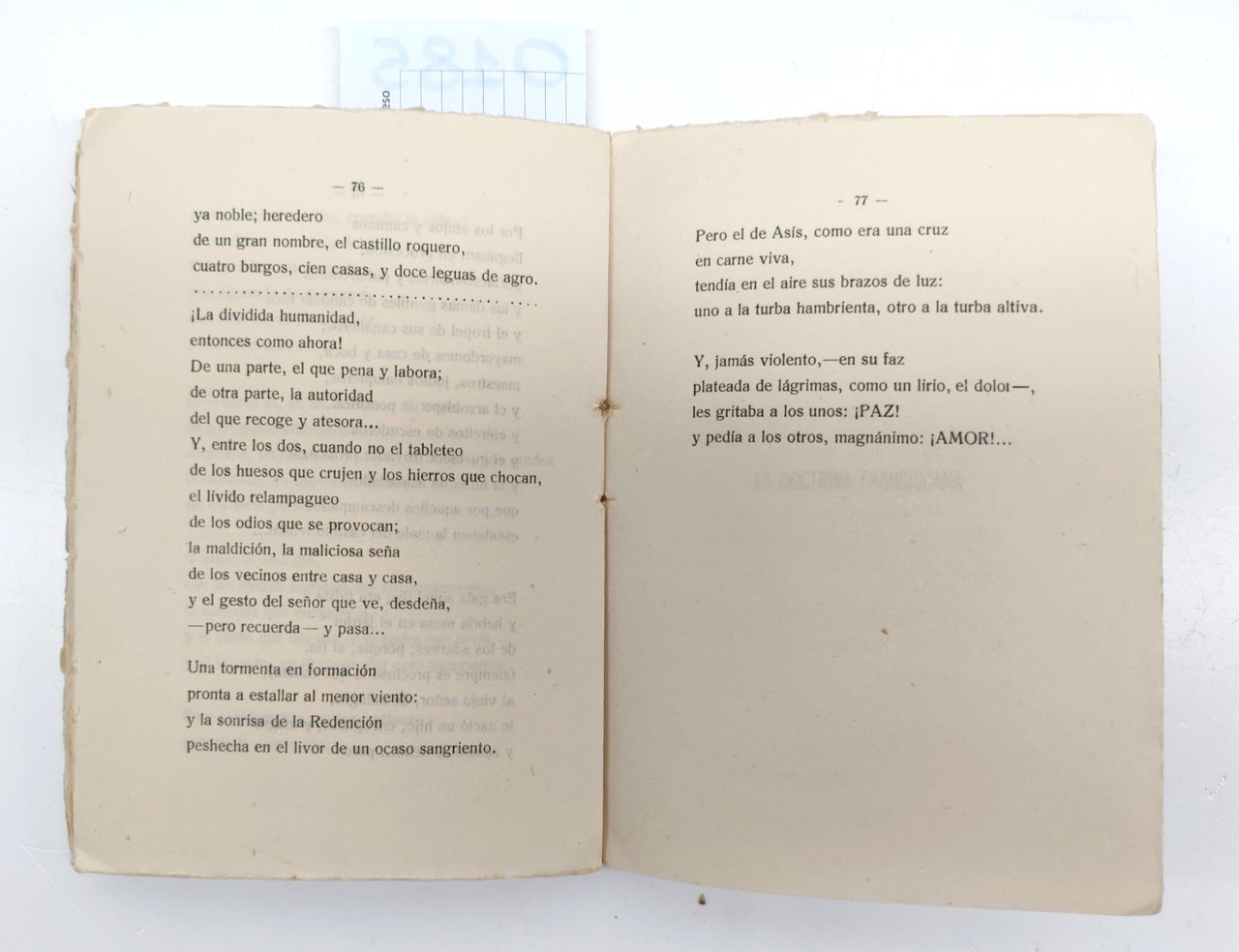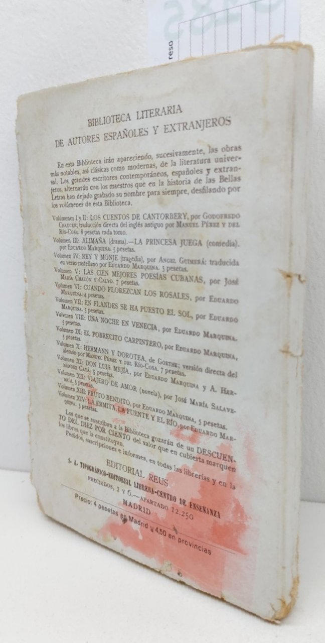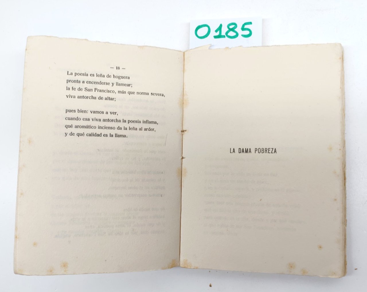 EDUARDO MARQUINA LA POESIA DE SAN FRANCISCO DE ASIS MADRID EDITORIAL REUS (S.A.) 1927 COPERTINA EDITORIALE MORBIDA CON UNA MACCHIA E PICCOLI STRAPPI ALL'UNGHIA, INTERNO IN BUONE CONDIZIONI FRONTESPIZIO CON FIRMA DI POSSESSO FIORITURE DIFFUSE, TAGLI IRREGOLARI, CARTA OVATTATA, UNA MACCHIA ROSSA ALLA QUARTA DI COPERTINA LE ULTIME QUATTRO PAGINE SONO A FOGLI CHIUSI N. PAG. 102 CM. 12,7 X 18.