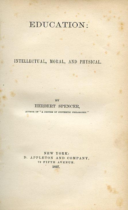 In-8°, pp. 283, (2), legatura del tempo m. pelle e angoli con titolo oro al dorso. Piatti marmorizzati, taglio di testa dorato. Qualche usuale fioritura. Buon esemplare. Edizione newyorkese di questo testo pedagogico dello Spencer (Education: Intellectual, Moral, and Physical'), volto alla disamina degli ideali criteri di educazione intellettuale, morale e fisica. L'opera ebbe tale risonanza da essere adottata come libro di testo sia in Inghilterra che negli Stati Uniti, orientando in modo decisivo la pedagogia ottocentesca in un'instante rivendicazione della spontaneità dell'educazione e della libertà del fanciullo. Cfr. Maria Maggi in Diz. Bompiani d. Opere, III, 31.