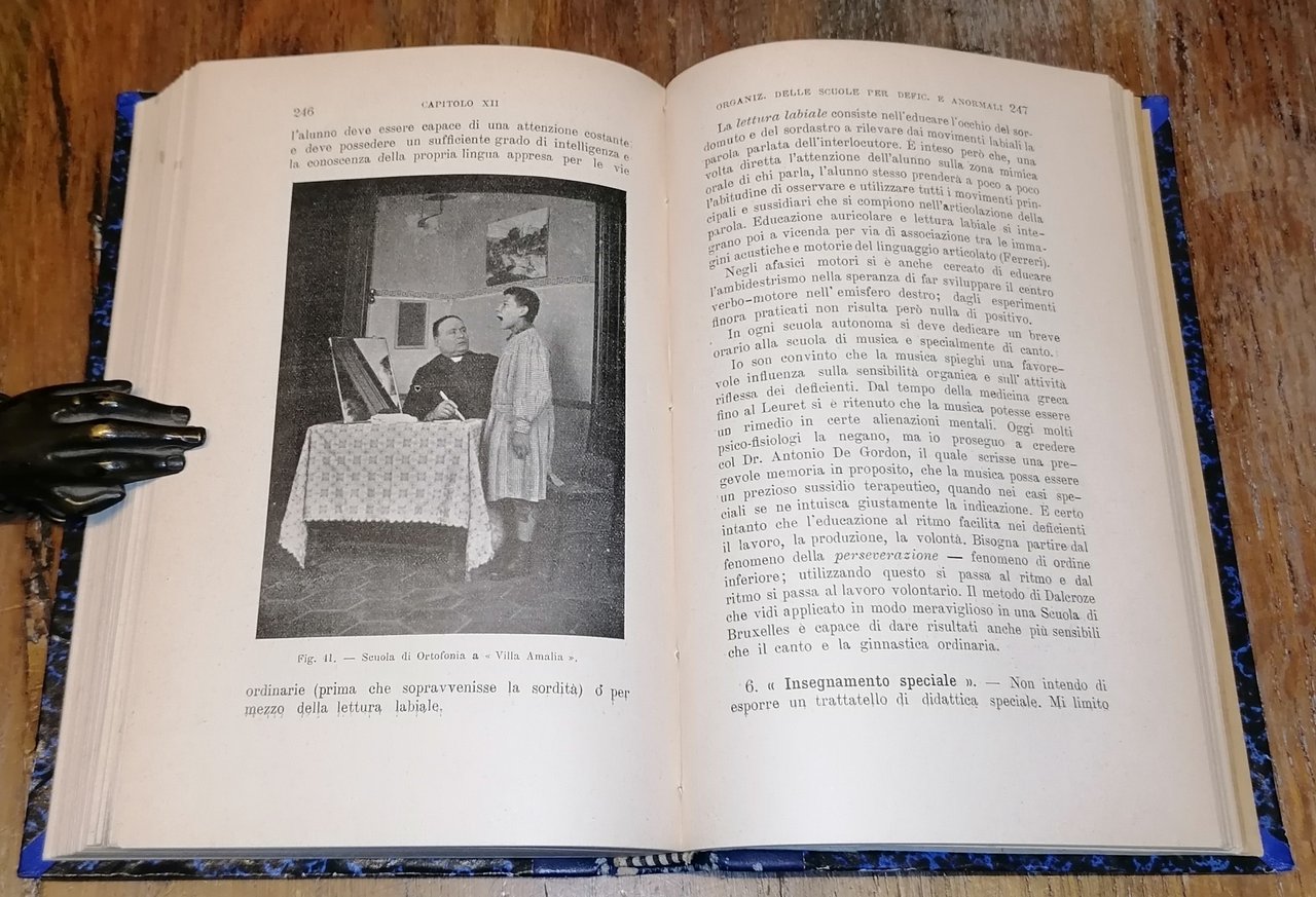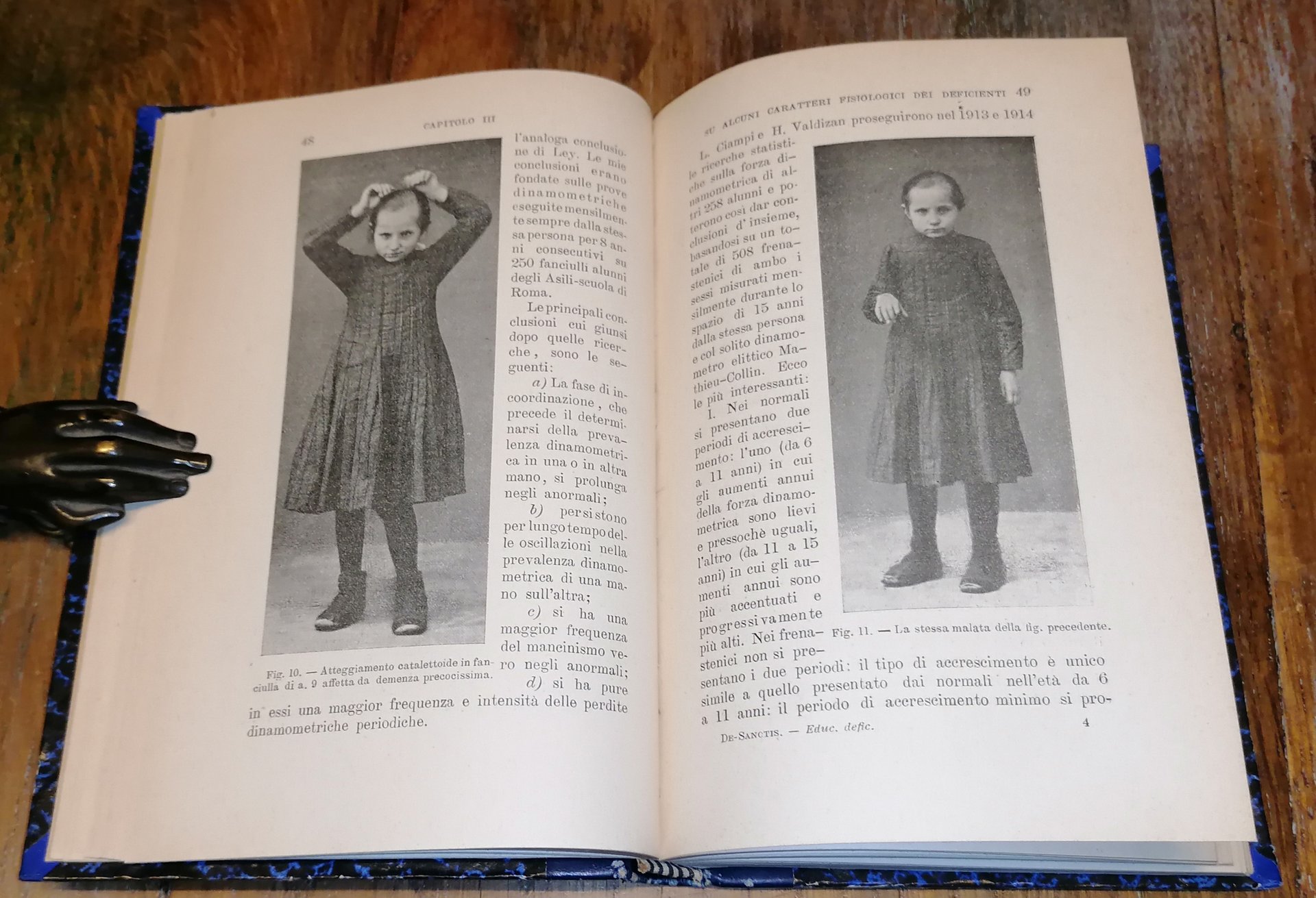 (Psichiatria - Neuropsichiatria infantile - Psicologia pedagogica - Pedagogia emendativa - Educazione dei fanciulli disabili) In 16° grande (cm 18,5 x 12,5), legatura coeva in mezza pelle nera con titoli e filetti impressi in oro al dorso, carta marmorizzata monocroma ai piatti, pp. XVIII, 300, con tabelle, grafici e 45 immagini fotografiche nel testo. Biblioteca Enciclopedica Vallardi, collezione "Pedagogica". Edizione originale. Circoscritta mancanza al margine bianco di pagina 23, peraltro volume in ottimo stato di conservazione.