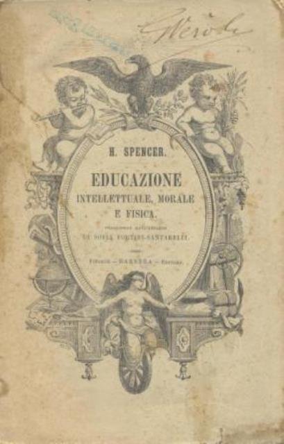 Traduzione dall'inglese di Sofia Fortini Santarelli. Firenze, Barbera Editore, 1900. In 8vo, pp. VI, 220 (con Indice), bross. edit. in carta illustrata al piatto. “L’educazione intellettuale, morale e fisica” fu pubblicata in Inghilterra nel 1861. Herbert Spencer (1820 – 1903), riprendendo molte idee di Rousseau e di Pestalozzi, conduce il naturalismo pedagogico al suo massimo sviluppo, integrandolo con elementi positivisti e sociologici. Il fine dell’educazione è la preparazione a una vita completa, cioè a una formazione della personalità tale da poter concorrere in modo efficace al progressivo miglioramento proprio e degli altri. Elabora quindi un sistema nel quale il principio dell’evoluzione diventa la base della realtà e della conoscenza umana, determinando un influsso profondo sullo sviluppo della pedagogia e in generale delle scienze umane in età positivista. Le tesi pedagogiche contenute nella sua “Educazione” volgono alla disamina dei criteri dell'educazione tradizione e costituiscono il manifesto del maturo positivismo pedagogico europeo, in relazione al quale, sulla base di una critica all’educazione tradizionale, cerca di sviluppare un sistema educativo a partire dai suoi fondamenti naturali scientificamente rilevabili. Il criterio dominante è quello dell’utile, coerente con la mentalità tecnico - industriale della società positivista, orientando in modo decisivo la pedagogia ottocentesca verso una rivendicazione della spontaneità dell'educazione e della libertà del fanciullo. L'opera ebbe tale risonanza al punto che essa venne adottata come libro di testo sia in Inghilterra che negli Stati Uniti, e già nel 1885 uscì la terza edizione della prima traduzione italiana. Elegante e coeva firma manoscritta, con la data del 1903, al piatto e alla prima bianca, timbri di anonima registrazione e di biblioteca ma con nome di appartenenza privata. Sottolineature a matita, dorso usurato, tracce alla brossura.
