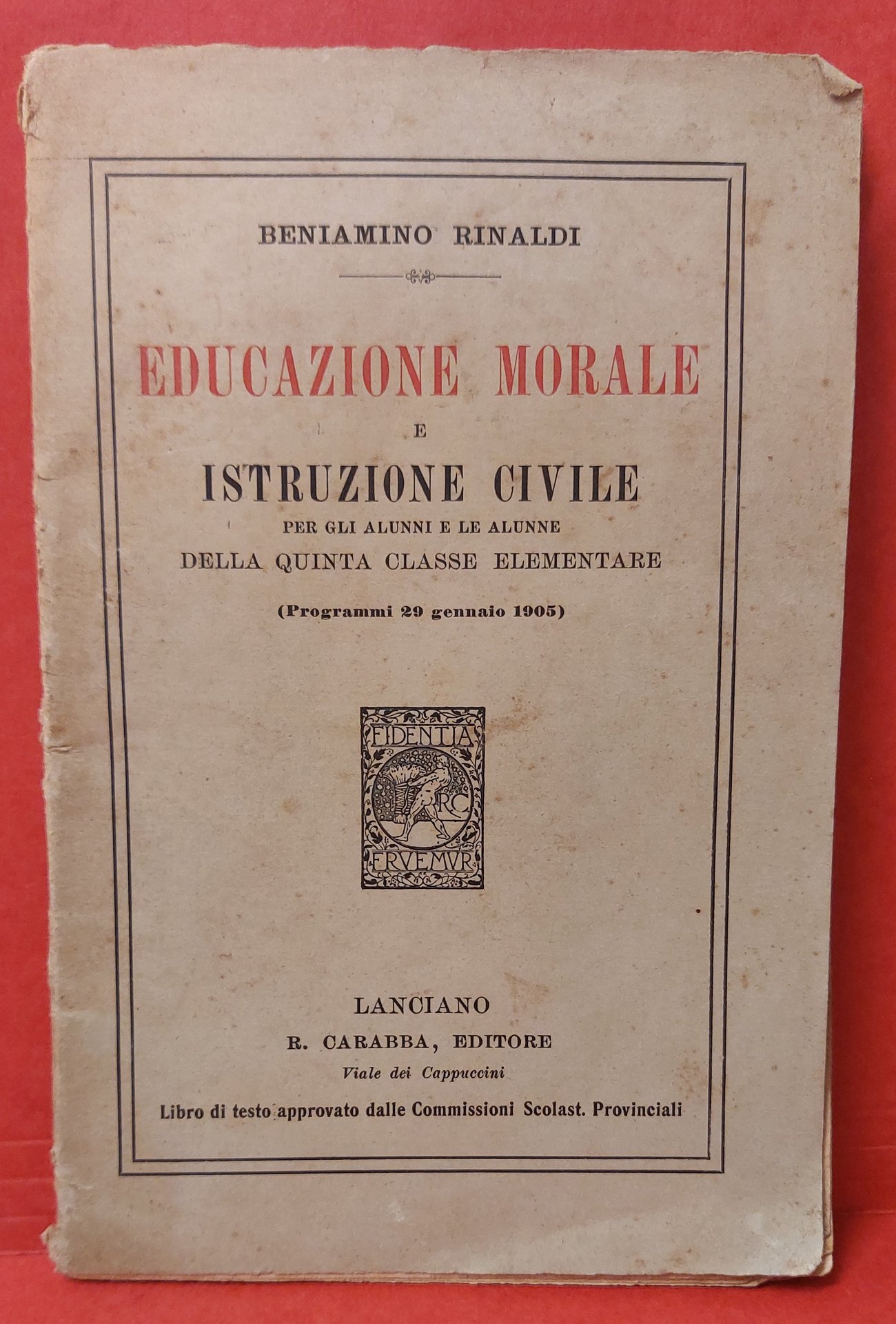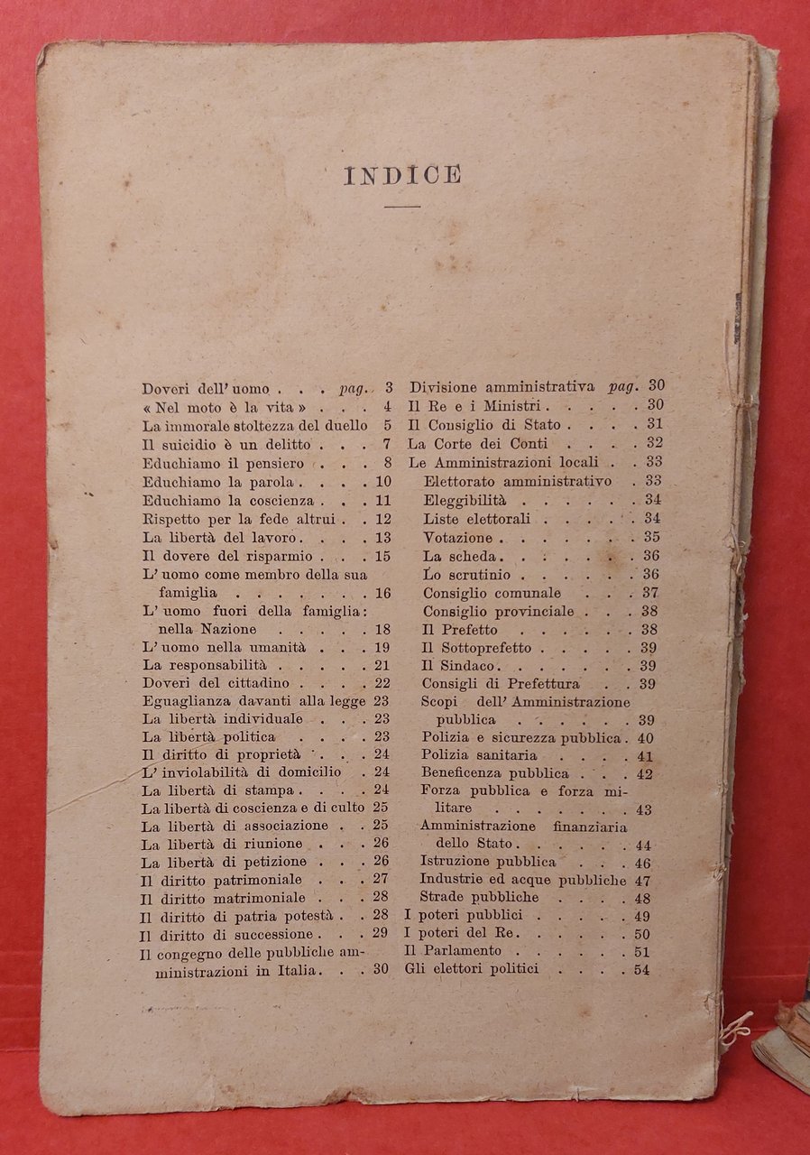 In 16° bross., pp. 56. Fascicolo inteso per la distribuzione nelle scuole elementari per l'educazione morale e civica. Contiene 60 "capitoli" che descrivono l'importanza di varii comportamenti e di responsabilità che l'uomo ha verso la vita e la sua comunità. Presenta logori sulla copertina, cuciture allentate e il corpo è staccato dalla copertina.