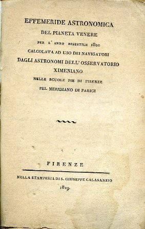 Effemeride astronomica del pianeta Venere per l'anno bisestile 1820 calcolata ad uso dei navigatori dagli astronomi dell'Ossevatorio Ximniano nelle scuole pie di Firenze pel meridiano di Parigi