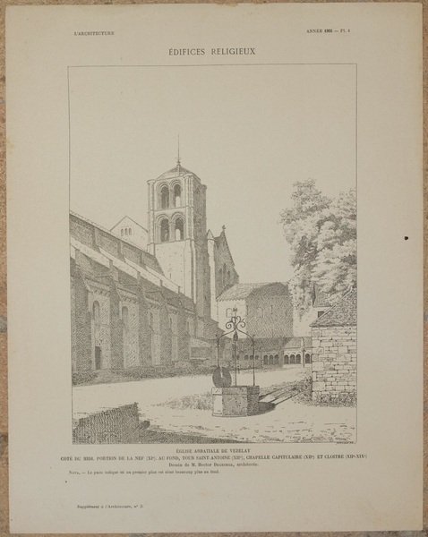 EGLISE ABBATIALE DE VEZELAY COTE DU MIDI PORTION DE LA NEF (XI) AU FOND, TOUR SAINT ANTOINE (XII) CHAPELLE CAPITULAIRE (XII) ET CLOITRE (XII-XIX) Dessin de M. Hector Degeorge architecte