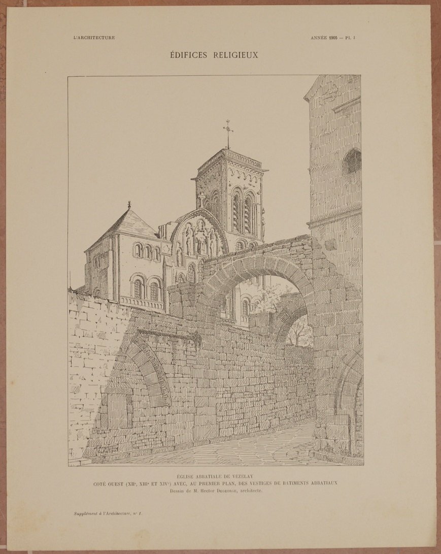 EGLISE ABBATIALE DE VEZELAY COTE OUEST (XII, XIII ET XIV) AVEC, AU PREMIER PLAN, DES VESTIGES DE BATIMENTS ABBATIAUX DESSIN DE M. HECTOR DEGEORGE ARCHITECTE