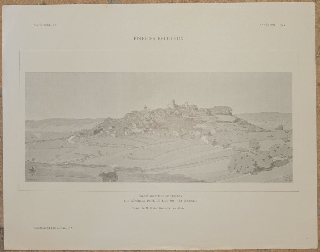 EGLISE ABBATIALE DE VEZELAY VUE GENERALE PRISE DU LIEU DIT "LA JUSTICE" DESSIN DE M. HECTOR DEGORGE ARCHITECTE