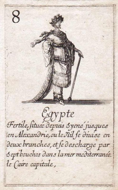 Incisione originale all'acquaforte; cm 8,7 x 5,5 alla battuta; su carta vergellata. Si tratta del III° stato di stampa. Ottima conservazione. La carta è tratta dal Jeu de la Géographie, una serie composta da 52 carte suddivise nei quattro semi per i quattro continenti conosciuti: l’Europa cuori, l’Africa quadri, l’Asia picche e America fiori. Su ordine di Mazzarino Jean Desmarets de Saint-Sorlin e Stefano Della Bella disegnarono e incisero nel 1644 quattro giochi per l'educazione del giovane Luigi XIV: il Jeu des Rois de France, il Jeu des Reines Renommées, il Jeu des Fables e questo Jeu de la Géographie.