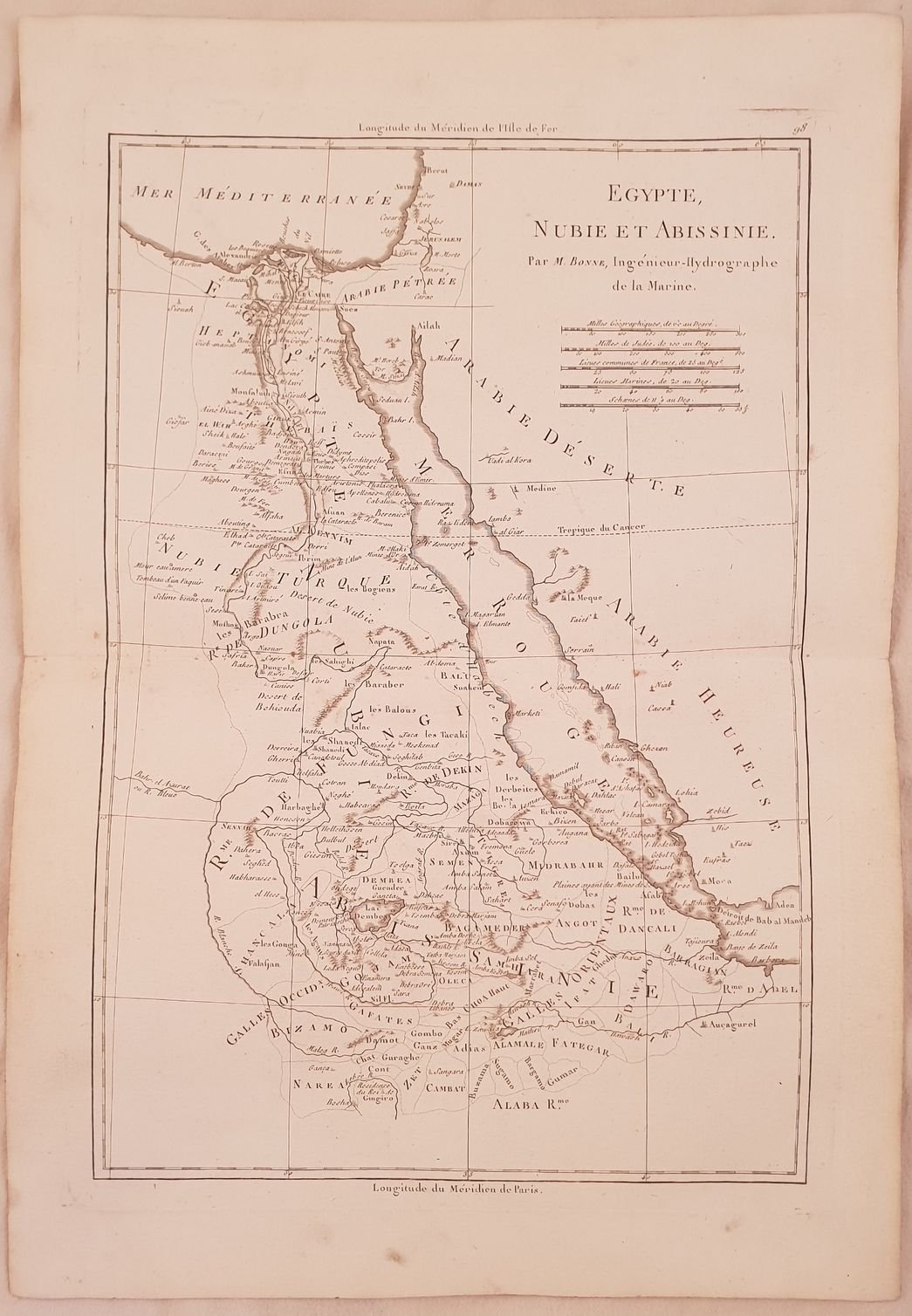 Mappa di Rigobert Bonne che mostra le coste dell'Egitto, Nubia and Abissinia (Egitto, Sudan ed Etiopia). Autore: Rigobert Bonne (1727-1755), André Data: 1780 circa Tecnica: incisione su rame Dimensione foglio: 42x29 cm Dimensione dell'incisione: 34x23 cm Condizioni: buone. Piegatura orizzontaleMap by Rigobert Bonne featuring the coasts of the Egypt, Nubia and Abissinia (modern-day Egypt, Sudan and Aethiopia). Author: Rigobert Bonne (1727-1755), André Date: 1780 circa Technique: copper engraving Leaf Dimension: 42x29 cm (16.5x11.4 inches) Engraving Dimension: 34x23 cm (13.4x9.1 inches) Conditions: Good conditions. Horizontal folding.