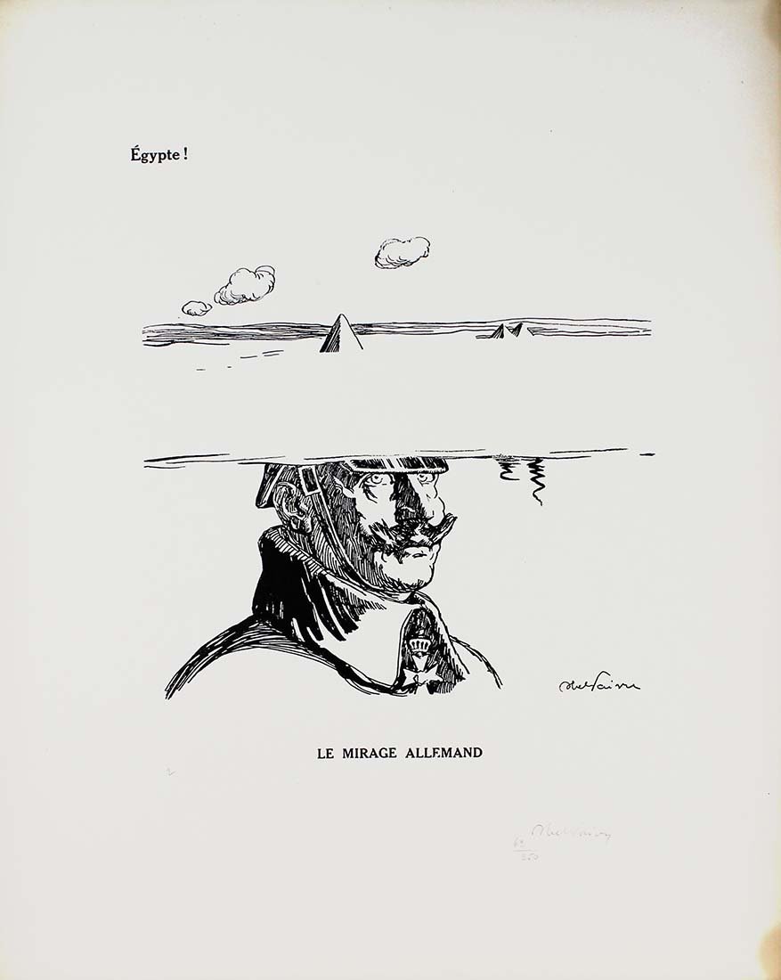 Abel Jules Faivre (Lione 1867 - Nizza 1945) Litografia originale firmata a mano dall'artista.Dimensioni: 56 x 38,5 cmCon certificato di autenticità C.O.A.Ingiallimento laterale come da foto.Esemplare numero 62/250 La raccolta di litografie umoristiche del caricaturista francese Abel Faivre (Lione 1867-Nizza 1945), andata a confluire nel volume Jours de guerre,fu pubblicata in due tomi tra il 1915 e il 1919. Con il procedere del conflitto, l'opinione pubblica di tutti i paesi coinvolti,che aveva dapprima affrontato tale evento con ottimismo, mutò rapidamente opinione sino a considerare la guerra, senza mezzi termini,come un avvenimento rovinoso. In tale contesto, le vignette satiriche di guerra possedevano un potente effetto catartico,adempivano un ruolo sociale irrinunciabile, fornendo una valvola di sfogo all’incombere dal più cupo pessimismo. Abel Jules Faivre (Lyon 1867 - Nizza 1945) Originale Lithographie vom Künstler von Hand signiert.Abmessungen: 56 x 38,5 cmMit Echtheitszertifikat C.O.A.Seitliche Vergilbung wie auf dem Foto.Kopieren Sie die Nummer 62/250 Die Sammlung humorvoller Lithographien des französischen Karikaturisten Abel Faivre (Lyon 1867-Nizza 1945), die in den Band Jours de guerre floss,es wurde zwischen 1915 und 1919 in zwei Bänden veröffentlicht. Im Verlauf des Konflikts wurde die öffentliche Meinung in allen beteiligten LändernWer dieses Ereignis anfangs mit Optimismus konfrontiert hatte, änderte schnell seine Meinung, um den Krieg ohne Zweifel zu betrachten.wie ein ruinöses Ereignis. In diesem Zusammenhang hatten die satirischen Kriegskarikaturen eine starke kathartische Wirkung.Sie erfüllten eine unverzichtbare soziale Rolle und bildeten ein Entlastungsventil gegen den dunkelsten Pessimismus. Abel Jules Faivre (Lyon 1867 - Nice 1945) Lithographie originale signée à la main par l'artiste.Dimensions: 56 x 38,5 cmAvec certificat d'authenticité C.O.A.Jaunissement latéral comme sur la photo.Copie numéro 62/250 La collection de lithographies humoristiques du caricaturiste français Abel Faivre (Lyon 1867-Nice 1945), qui allait se fondre dans le volume Jours de guerre,il a été publié en deux volumes entre 1915 et 1919. À mesure que le conflit progressait, l'opinion publique de tous les pays impliqués,qui avait d'abord fait face à cet événement avec optimisme, a rapidement changé d'avis pour envisager la guerre, en termes non équivoques,comme un événement ruineux. Dans ce contexte, les caricatures de guerre satiriques ont eu un puissant effet cathartique,ils remplissaient un rôle social indispensable, fournissant une soupape de décharge du pessimisme le plus sombre. Abel Jules Faivre (Lyon 1867 - Nice 1945) Original lithograph signed by hand by the artist.Dimensions: 56 x 38.5 cmWith certificate of authenticity C.O.A.Lateral yellowing as in the photo.Copy number 62/250 The collection of humorous lithographs by the French caricaturist Abel Faivre (Lyon 1867-Nice 1945), which went to flow into the volume Jours de guerre,it was published in two volumes between 1915 and 1919. As the conflict progressed, public opinion in all the countries involved,who had initially faced this event with optimism, quickly changed his opinion to consider the war, in no uncertain terms,like a ruinous event. In this context, the satirical war cartoons had a powerful cathartic effect,they fulfilled an indispensable social role, providing a relief valve from the darkest pessimism.