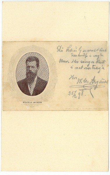 1 S. Qu.-8vo. Briefkarte mit gedr. Portrait des Musikers, darauf in Bleistift ein launiger vierzeiliger Reim in Wiener Mundart.