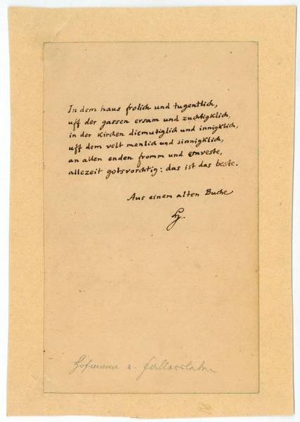 ½ S. 8vo. In dem haus frolich und tugentlich, | uff der gassen ersam und zuchtigklich, | in der kirchen diemutiglich und inniglich, | uff dem velt menlich und sinnigklich, | an allen enden fromm und ernveste, | allezeit gotsvorchtig: das ist das beste. | - Aus einem alten Buche | H. - Der Reimspruch des 15. Jahrhunderts war 1835 in Wilhelm Wackernagels "Altdeutschem Lesebuch" erschienen. - Auf Trägerpapier montiert.