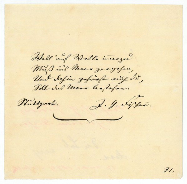 1 S. Kl.-4to. Well' auf Welle immerzu | Muß in's Meer zergehen, | Und dahin gehörst auch Du, | Soll das Meer bestehen. - Johann Georg Fischer unterrichtete seit 1859 an der Kaufmännischen Fortbildungsschule und war neben dem Lehrberuf auch literarisch tätig, "veröffentlichte vor allem Lyrik (u. a. 'Gedichte', 1854), später auch Bühnenwerke. Er pflegte mit vielen Dichtern seiner Zeit, u. a. mit Wilhelm Raabe, freundschaftlichen Umgang. Fischer war der Vater des Germanisten Hermann Fischer (DBE).