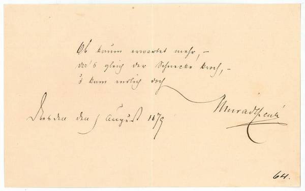 1 S. Qu.-8vo. Ob kaum erwartet mehr, - / da's gleich der Schnecke kroch, - / 's kam endlich doch. - Der zum Islam konvertierte österreichische Schriftsteller und Diplomat in osmanischen Diensten Franz von Werner publizierte unter dem Namen "Murad Efendi" Dramen und Gedichtsammlungen wie auch landeskundliche Berichte aus der Türkei. - Verso alter Sammlervermerk in roter Tinte: "7. Aug. 1879 erh.".