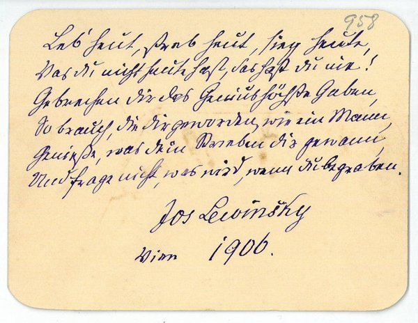 90:115 mm. Beiliegend ein eh. an einen Georg Nachod in Prag adr. Kuvert. Leb' heut, streb heut, sieg heute, / Was du nicht heute hast, das hast du nie! / Gebrechen dir des Genius höchste Gaben, / So brauch, die dir geworden, wie ein Mann, / Genieße, was dein Streben dir gewann, / Und frage nicht, was wird, wenn du begraben. - Lewinsky debütierte 1855 am Theater an der Wien, wurde 1856 vom Brünner Stadttheater engagiert und gab 1858 sein Debüt am Wiener Burgtheater, dessen Ensemble er seither angehörte. Der Publikumsliebling, der 1865 zum k. k. Hofschauspieler auf Lebenszeit ernannt wurde, brillierte in allen großen Charakterrollen, besonders im Intrigantenfach, und war später auch als Komiker und in Volksstücken erfolgreich.