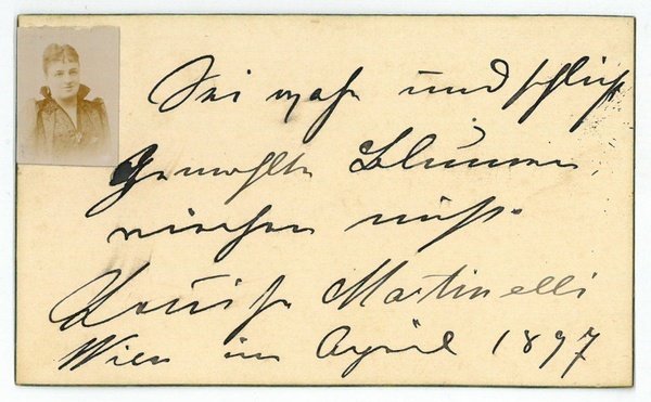 1 S. Qu.-8vo. Mit einer am oberen Rand montierten Portraitphotographie. Sei wahr und schlicht | Gemahlte Blumen riechen nicht [.]. - Luise Martinelli, die zweite Ehefrau Ludwig Martinellis, führten Engagements zuerst an das Theater an der Wien und dann an das Deutsche Theater in Prag. Ab 1889 war Luise Martinelli Ensemblemitglied des Deutschen Volkstheaters in Wien.