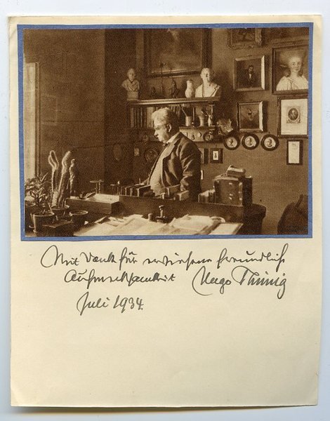 1 S. 8vo. Mit alt montiertem Portrait (Zeitungsausschnitt) und alt auf Trägerpapier montiert. Mit Dank für erwiesene freundliche Aufmerksamkeit. - Der aus Dresden stammende "Charlie Chaplin der Bühne" (zit. n. Czeike V, 448) war von 1874 bis 1923 Mitglied und von 1912 bis 1917 auch Direktor des Wiener Burgtheaters. Später am Theater in der Josefstadt, brillierte Thimig im Charakterfach wie in zahlreichen komischen Rollen. Als Sammler von Theatralia trug der Vater von Helene, Hans und Hermann Thimig eine umfangreiche Sammlung zusammen, die den Grundstock der Theater-Sammlung der Österreichischen Nationalbibliothek, des heutigen Österreichischen Theatermuseums, bildete.