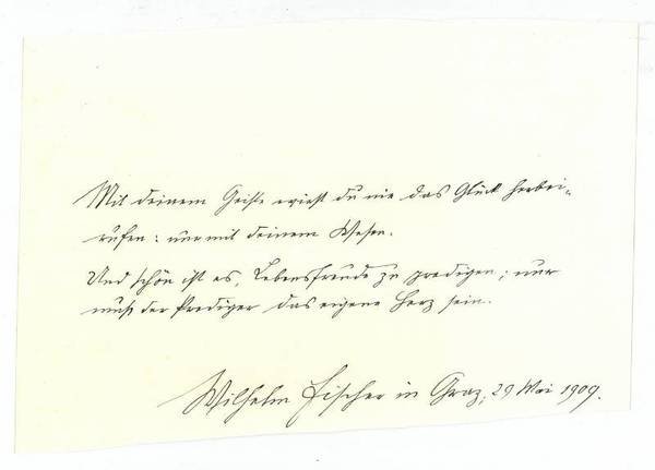 1 S. Qu.-gr.-8vo. Mit deinem Geiste wirst Du mir das Glück herbeirufen: nur mit deinem Wesen. Und schön ist es, Lebensfreude zu predigen; nur muß der Prediger das eigene Herz sein. - Fischer, von 1901 bis 1919 Direktor der Steiermärkischen Landesbibliothek, war eine der zentralen Persönlichkeiten des Grazer literarischen Lebens ("Fischer-Graz" galt über Jahre hinweg als eine feste Wendung) und Obmann des Steirischen Schriftstellerbundes. Sein Erstlingswerk, die Novelle "Eine Sommernachtstragödie", erschien 1872, mit den "Grazer Novellen" (1898) gelang ihm der literarische Durchbruch. Der Entwicklungsroman "Die Freude am Licht" (1902) begründete seinen Ruhm als Grazer Stadtpoet.
