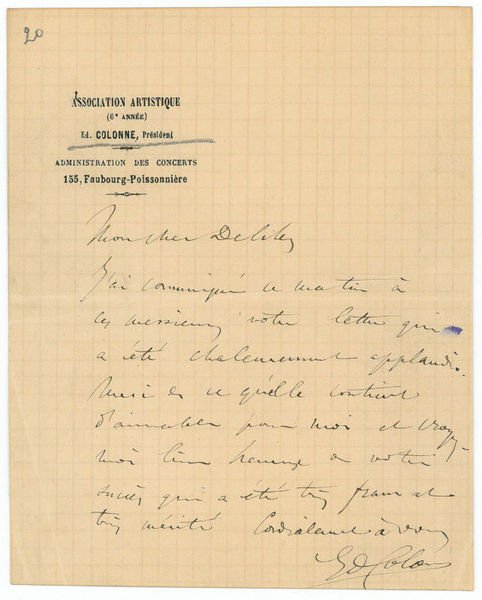 1 S. auf Doppelblatt. Kl.-8vo. An den Komponisten Léo Delibes (1836–1891), dem er für seinen Brief und den ihn betreffenden liebenswerten Inhalt dankt und dem er seine Freude über dessen wohlverdienten Erfolg zum Ausdruck bringt: „J’ai communiqué ce matin à ces messieurs votre lettre qui a été chaleureusement applaudi. Merci en ce qu’elle contient d’aimable pour moi et croyez-moi bien heureux de votre succès qui a été très franc[?] est très mérité [.]“. – Édouard Colonne war erster Violinist des Orchesters der Opéra de Paris und gründete 1873 das „Concert National“, woraus 1874 die „Association artistique“ wurde, deren Konzerte zunächst im Théâtre de l’Odéon, später im Châtelet stattfanden. „Insgesamt brachte Colonne einige tausend Werke von fast zweihundert Komponisten zur Aufführung. Sein Name bleibt vor allem eng verbunden mit der wahrhaft großartigen Interpretation der Werke von Hector Berlioz. Diese, die zu Lebzeiten des Komponisten vom Publikum oft abgelehnt wurden, fanden in Colonne einen begeisterten und fähigen Dirigenten, der ihnen zu dauerhaftem Erfolg verhalf“ (MGG XV, 1553). Zu den zahlreichen französischen Komponisten, die ihm viel verdanken, gehören u. a. Camille Saint-Saëns, Jules Massenet, Gabriel Fauré, Vincent d’Indy, Marc-Antoine Charpentier, Claude Debussy, Maurice Ravel, Charles-Marie Widor, Paul Dukas und Emmanuel Chabrier. „Daneben wurden in Vergessenheit geratene Werke wie ‚Fausts Verdammnis’ von Hector Berlioz wiederentdeckt, auch die Werke ausländischer zeitgenössischer Komponisten wie Richard Wagner und Richard Strauss kamen auf den Spielplan. Das Orchester lud große Dirigenten wie Felix Mottl und Felix Weingartner ein, und Komponisten wie Gustav Mahler, Peter Tschaikowski, Claude Debussy, Edvard Grieg, Richard Strauss und Sergei Prokofjew kamen, um ihre Werke aufzuführen“ (Wikipedia, Abfrage v. 5. X. 2008). – Auf Briefpapier mit gedr. Briefkopf der „Association artistique“; papierbedingt etwas gebräunt.
