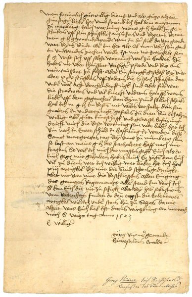 1 S. Folio. Mit papiergedecktem Siegel (eingerissen) und Adresse (Name getilgt). An [Gerhard Pichler?] und wohl im Zusammenhang mit einem an den "Ritterkrieg" sich anschließenden Streit zwischen dem Landgrafen Philipp dem Großmütigen von Hessen und dem Reich, das sich der Ansprüche einiger mit Franz von Sickingen verbündet gewesener Ritter angenommen hatte. "[.] Ich hab dem amptman zü marburg Etlich warnung meins g[nädigen] h[errn] [d. i. Fürstbischof Konrad III. von Würzburg?] halb zü geschriben uff sein schrifftlich ansuchen und Begern, da mit mein g[nädiger] h[err] gewarndt werde, wan in der still da von geredt wirt, Beym Bundt oder im her, als ob man uber sein gand [verschrieben für "land"?] im umwenden ziechen wölle, ist mir nit zweyffels sein f[ürstlich] g[naden] wiß sich uff solche warnung wol zü hallten, sye haben nit uber thaussent Reissiger pferde und Bis an neuntaussent zü fuß, aber Ein stargk geschoß Bey vier oder XXV stugken uff Redern die Eyssen schiessen, dar under wol acht Brechender stugk sind, aber fur war, die stradiotten und vil knecht underm hauffen wern lieber uff dem gegentheil dan Beym pund [.] Ich hab XIII artigkel Bey mir, die Sind schon gedrugkt, aber nit von mir, die Beschliessen allen Eingang des gannczen Regamenczs aller stend im Reich [.]". - Aus der 1911 durch C. G. Boerner versteigerten Sammlung Carl Geibel. - Von größter Seltenheit. - Mit kleinen Randläsuren und kl. Montagespuren verso.