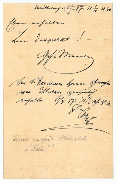 Zusammen (3+1=) 4 SS. auf 4 (= 2 Doppel-)Blatt. 8vo. An den namentlich nicht genannten Landesverteidigungsminister Generalmajor Julius Joachim Ludwig Frhr. von Horst: "Leider habe ich bis jetzt das so bestimmt und sehnlichst erwartete Telegramm aus Wien nicht erhalten. Mir ist diese Verzögerung im höchsten Grade unangenehm und peinlich und kann mir das Ausbleiben des Telegramms nur dadurch erklären, daß der recommandirte Brief Fst. H. erst zugestellt wurde als er seinen täglichen Vortrag schon erstattet hatte und daher erst morgen die Gelegenheit zur Sprache bringen wird. Vielleicht aber erhalte ich aber auch morgen früh eine briefliche Antwort, was ich aber kaum glaube. Wie ich irgend welche Mittheilungen aus Wien erhalte, werde ich mir erlauben sie sogleich mitzutheilen [.]" (a. d. Br. v. 5. II. 1887). - Die Mitteilung v. 6. IV. 1887 des Inhalts: "Eben erhalten! Bin desperat!"