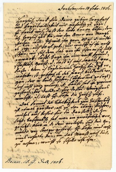 2 SS. auf Doppelblatt. 8vo. An einen namentlich nicht genannten Adressaten: "Herzlichen Dank für Deine gütige Sorgfalt und Bereitwilligkeit mir gefällig zu seyn! Es freut mich, daß der liebe brave Böhm, dem ich herzlich gut bin, mir den Amor von Mangs stechen will [.] Wenn ich Seydelmanns Zeichnung bei Dyk erwähnte, so geschah es des herrl. Ausdrucks wegen, der in beiden Kupfern (unter uns gesagt) doch nicht ganz gelungen ist. Bause hat ihn zweimal gestochen, für Dresden u. für Dessau. Wenigstens wünschte ich, daß H. Böhm die Zeichnung sähe. Das Format zum Titelkupfer zum Taschenbuch ist etwas größer, als zu den übrigen Kupfern, welches auch besser für die Darstellung ist [.]". - Wilhelm Gottlieb Becker war seit 1795 Inspektor der Dresdener kurfürstlichen sächsischen Antikengalerie und des Münzkabinetts und erhielt 1805 die Aufsicht über das "Grüne Gewölbe" und den Titel eines kgl. sächsischen Hofrats. "Becker schrieb Lyrik ('Gedichte an Elisen', 1775), übersetzte u. a. Dandré Bardons 'Costume der ältesten Völker' (4 Hefte, 1776/77) und war Herausgeber einiger Periodika, darunter 1794-1814 des 'Taschenbuchs zum geselligen Vergnügen'. Er war ein Verfechter des englischen Landschaftsgartens in Deutschland. Sein kunstgeschichtliches Hauptwerk 'Augusteum. Dresden's antike Denkmäler enthaltend' (3 Bde.) erschien 1804-11" (DBE).