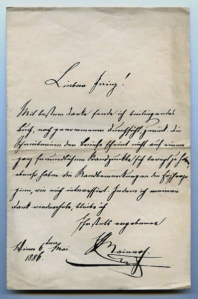 1 S. auf Doppelblatt. Gr.-8vo. An den namentlich nicht genannten Prinz Konstantin zu Hohenlohe-Schillingsfürst (1828-96): "Mit bestem Danke sende ich beiliegendes Buch, nach genommener Durchsicht, zurück. Die Schreiberin der Briefe scheint nicht auf einem ganz freundlichen Standpunkte sich bewegt zu haben, ebenso haben die Randbemerkungen die Erzherzogin wie mich interessiert [.]". - Der Sohn Erzherzog Rainer Josefs von Österreich trat 1843 in den Militärdienst ein, wurde 1852 Inhaber eines Infanterie-Regiments und 1861 Feldmarschalleutnant. Vier Jahre lang war er Präsident des ständigen Reichsrats, später Ministerpräsident und gehörte über vierzig Jahre lang dem Herrenhaus an. Zudem Kommandant der österreichischen Landwehr und Feldzeugmeister, fungierte er auch mehr als 50 Jahre als Kurator der Akademie der Wissenschaften.