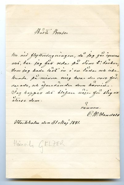 1 S. auf liniert. Doppelblatt. 8vo. An seinen Bruder: "Bu vid flyttningningen, då jag går igenom allt, har jag fått reda på dine 2n. böcker, som jag hade lägt in i en låda och icke kunde påminna mig hvar de vore för. Varade, och öfaervänder dem härvid. Jag hoppas det blifaer nöje för dig att återse dem [.]". ("Wegen des Umzugs, wo ich alles durchgehe, habe ich deine anderen Bücher ausfindig gemacht, die ich in eine Kiste gelegt hatte und mich nicht mehr entsann, wo sie waren. Für die Dauer übergebe ich sie hiermit. Ich hoffe, es ist dir eine Freude, sie wiederzusehen [.]").