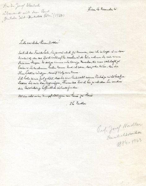 ½ S. Gr.-4to. Wie von alter Hand in Bleistift vermerkt, an Josef Wernisch zur Übersendung von Nadlers Buch "Deutscher Geist, deutscher Osten": "Seit ich die Freude habe, Sie persönlich zu kennen, war ich in Sorge um den Eindruck, den das Buch wohl auf Sie machen würde. Nun nehmen Sie mir einen Stein vom Herzen. Es sind ja immer nur wenige Menschen, die man wahrhaft zu Lesern u. Teilnehmern haben kann [.]". - Josef Nadler war seit 1931 als Ordinarius für deutsche Literatur an der Universität Wien tätig, veröffentlichte über 300 germanistische Arbeiten und wurde insbesondere durch seine 1912-28 erstmals erschienene "Literaturgeschichte der deutschen Stämme und Landschaften" bekannt, in der er, ausgehend von Stämmen und Siedlungsbewegungen, die Entwicklung der deutschen Literatur aus landschaftlicher Perspektive beschrieb. Wiewohl die vierte Auflage des großen Werkes rassentheoretische Thesen beinhaltet, die konträr zu den vorangegangenen das Gegenteil behaupten und wohl nur als Konzession an die neuen Machthaber verstanden werden können, bietet die "Literaturgeschichte" eine Fülle an Fakten und Daten. Nach Kriegsende wurde Nadler, der ehedem mit Hofmannsthal und Weinheber befreundet gewesen war, die Lehrbefugnis entzogen. Seine Autobiographie "Kleines Nachspiel" erschien 1954. Vgl. Czeike IV, 343f. und Kosch XI, 14f. - Mit kleinen Randläsuren.