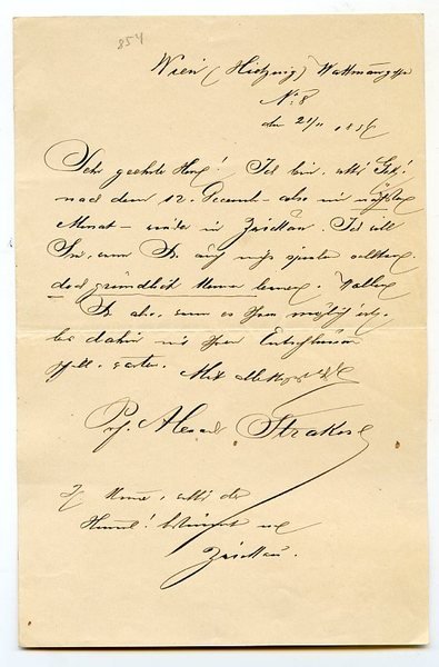 1 S. auf Doppelblatt. Gr.-8vo. An den namentlich nicht genannten Schauspieler Hans Siebert (1872-1953): "Ich bin [.] nach dem 12. December - also im nächsten Monat - wieder in Zwickau. Ich will Sie, wenn Sie auch nicht spielen sollten, doch gründlich kennen lernen. Wollen Sie also, wenn es Ihnen möglich ist, bis dahin mit Ihren Entschlüssen [.] warten [.]". - Alexander Strakosch debütierte 1862 in Troppau, spielte am Deutschen Theater in Pest, 1865-67 am Hoftheater in Hannover und ging dann nach Paris, wo er sich bei Mitgliedern der Comédie française weiterbildete. Nach seiner Rückkehr nach Wien mußte er seine Bühnenkarriere aus gesundheitlichen Gründen aufgeben, gab Rezitationsabende, wurde 1868 Mitarbeiter Heinrich Laubes am Stadttheater in Leipzig und 1872 am Wiener Stadttheater in Wien; seit 1880 ging er mit seinem Rezitationsprogramm auf Tournee, u. a. 1887 und 1888 in die USA. Zuletzt war Strakosch als Professor an der Akademie in München und als Sprecherzieher am Wiener Burg- bzw. Volkstheater tätig. - Papierbedingt leicht gebräunt und gering fleckig; in altem Sammlungsumschlag.