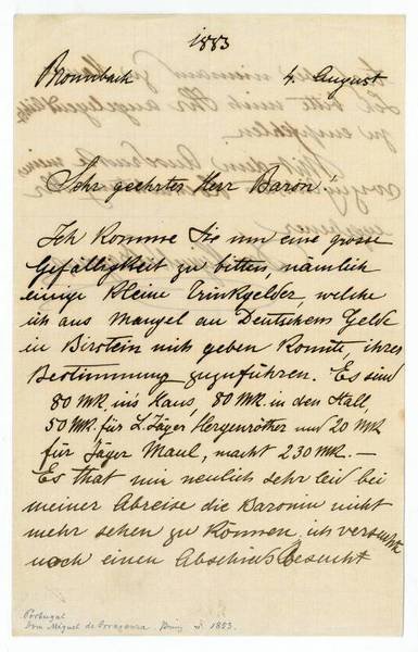 1½ SS. auf Doppelblatt. 8vo. An einen namentlich nicht genannten Baron: "Ich komme Sie um eine grosse Gefälligkeit zu bitten, nämlich einige kleine Trinkgelder, welche ich aus Mangel an Deutschem Gelde in Birstein nicht geben konnte, ihrer Bestimmung zuzuführen. Es sind 80 MK. in's Haus, 80 MK. in den Stall, 50 Mk. für L. Jäger Hagenröther und 20 Mk für Jäger Maul, macht 230 MK. […]".