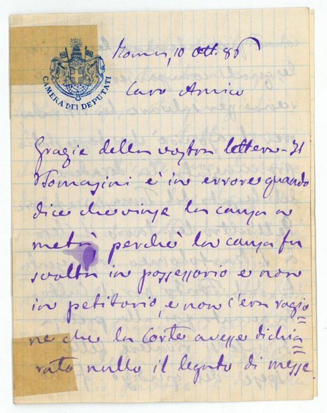 6 SS. auf 4 Bll. Kl.-8vo. In italienischer Sprache an einen namentlich nicht genannten Adressaten. - Auf Briefpapier mit gedr. Briefkopf der Camera dei Deputati.
