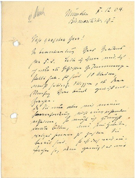 1½ SS. auf gefalt. Doppelblatt. 8vo. Sehr geehrter Herr! In Beantwortung Ihres Schreibens vom 5. d. teile ich Ihnen mit, daß ich nun die Geschichten zusammengestellt habe. Es sind 10 kleine, meist satirische Skizzen, die dem Umfang [?] Ihrer Bände gewiß entsprechen. Da Sie nun aber mit meiner Honorarforderung nicht einverstanden erscheinen, so möchte ich zunächst darum bitten, mir mitzuteilen, welches Honorar zu zahlen Sie bereit sind. Es ist doch weit einfacher so, denn genügt es mir nicht, so können Sie sich die Mühe ersparen, die Sachen zu lesen, und ich brauche sie erst gar nicht lange Ihnen zu schicken. So sparen wie dann wenigstens beiderseits Zeit [.]. - Am linken Rand gelocht (keine Textberührung).
