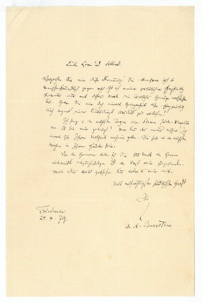 1 S. Gr.-8vo. Lieber Herr und Freund. | Verzeihen Sie mir diese Benennung! Sie benehmen sich so menschenfreundlich gegen mich, daß ich meiner persönlichen Empfindung hierüber nur mit diesem Worte ein innerliches Genüge verschaffen kann. Geben Sie mir doch einmal Gelegenheit, dieser Empfindung durch irgend einen Liebesdienst Ausdruck zu verleihen! [.]. - Der aus Danzig stammende Schriftsteller und Publizist hatte 1848 Barrikadenkämpfer an der Revolution teilgenommen und im Jahr darauf die "Urwählerzeitung. Organ für Jedermann aus dem Volk", nach deren Verbot (1851) im Jahr 1852 die "Volkszeitung" gegründet. "Bernstein verfaßte außerdem zahlreiche naturwissenschaftliche Werke ('Naturwissenschaftliche Volksbücher', 21 Bde., 1855/56). In seinen literarischen Schriften beschäftigte er sich vorwiegend mit dem Judentum, so z. B. in der Novelle 'Mendele Gibbor' (1860)" (DBE).