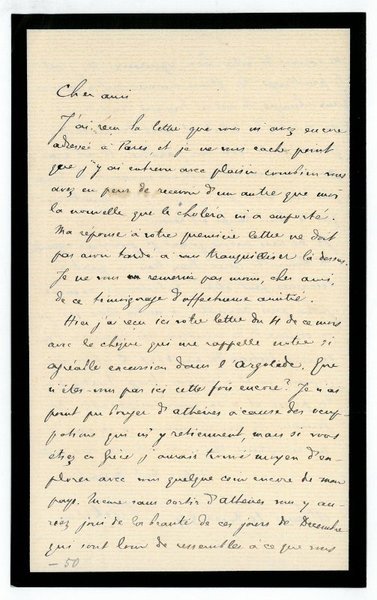 2 SS. auf Doppelblatt. 8vo. In französischer Sprache an einen Freund. - Auf Briefpapier mit schwarzem Trauerrand.