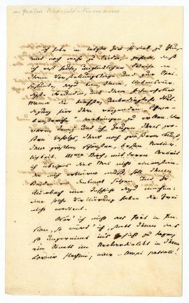 1¾ SS. 8vo. An Luise Gräfin von Schönfeld-Neumann (1818-1905): "Ich habe in letzter Zeit so viel zu thun, - und noch mehr zu leiden, - gehabt, daß ich erst heute unglücklicher Weise an Ihrem Vorstellungstage […] dazu kam, Ihnen, liebenswürdigste Freundin, und Ihrer hochverehrten Mama die tiefste, unbedingteste Huldigung für Ihre reizenden ‚Schwabenstreiche' verbringen zu wollen […]". - Luise Gräfin von Schönfeld-Neumann war die Tochter des Schauspielerehepaars Karl Neumann und Amalie Haizinger und erhielt Schauspielunterricht bei ihrer Mutter.