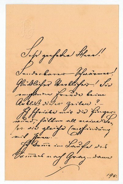 1½ SS. 8vo. An einen namentlich nicht genannten Adressaten: "Sonderbarer Schwärmer! Glücklicher Sterblicher! […] Ich schriebe mir die Finger wund, hätten all meine Leser die gleiche Empfindung mit Ihnen. Ich komme im Laufe des Sommers nach Graz - dann suche ich Sie auf. Leben Sie glücklich, und bewahren Sie sich Ihre Unschuld […]". - Auf Briefpapier mit gepr. Briefkopf. - Dorn übernahm 1867 die künstlerische Leitung des Josefstädter Theaters, mit der er seine bereits zuvor begonnene bühnenschriftstellerische Arbeit verband.